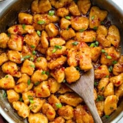 Crispy, saucy, and packed with flavor, this sweet chili chicken is a weeknight winner! Tender chicken bites get a crunchy coating, then get tossed in a sticky, sweet, and slightly spicy sauce. YUM!